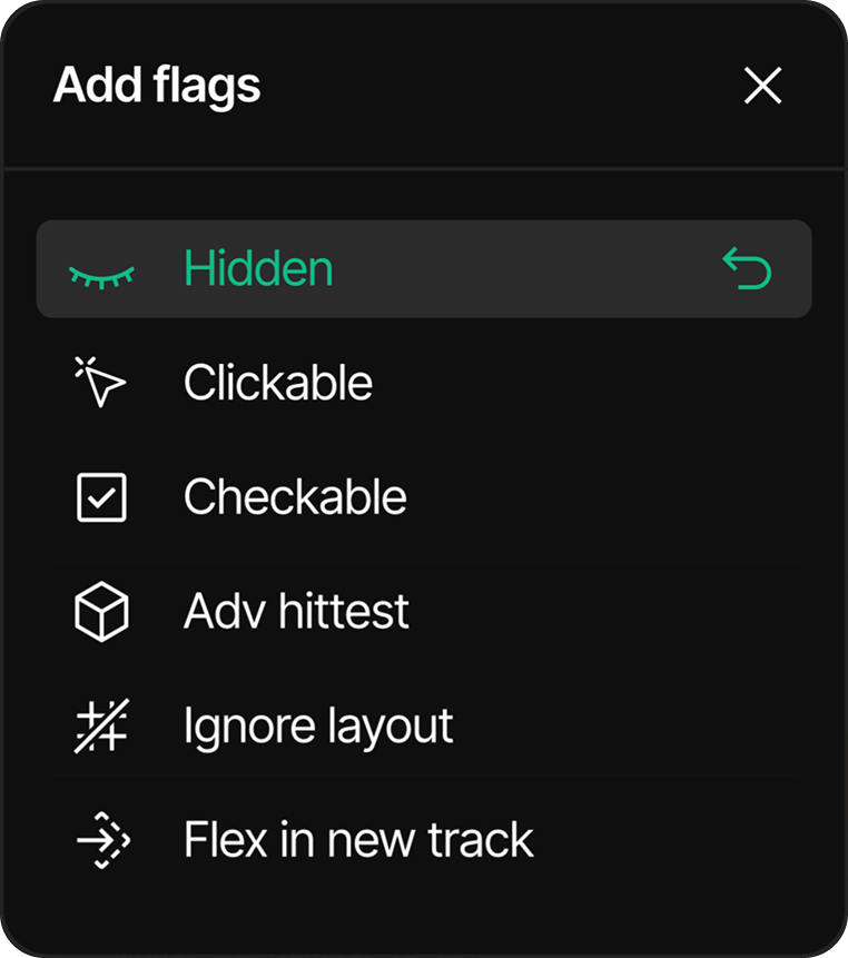 Flags define special behaviors and characteristics for UI elements. They allow you to enable or disable specific functionality for screens, containers, and widgets without writing code.